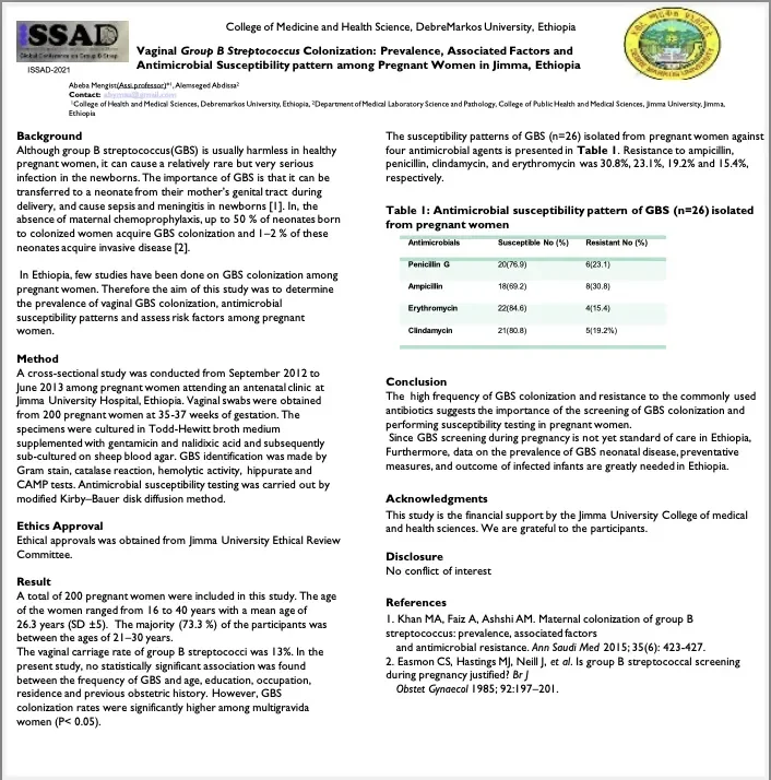 Congratulations to Abeba Mengist, Assistant Professor of Medical Microbiology in Debre Markos University, Ethiopia. Abeba’s poster submission ‘Vaginal Group B Streptococcus Colonization: Prevalence, Associated Factors and Antimicrobial Susceptibility pattern among Pregnant Women in Jimma, Ethiopia’, was awarded best poster prize by the attendees of the 2nd International Symposium on ‘Streptococcus agalactiae’ Disease that took place online 3rd – 5th November 2021.
